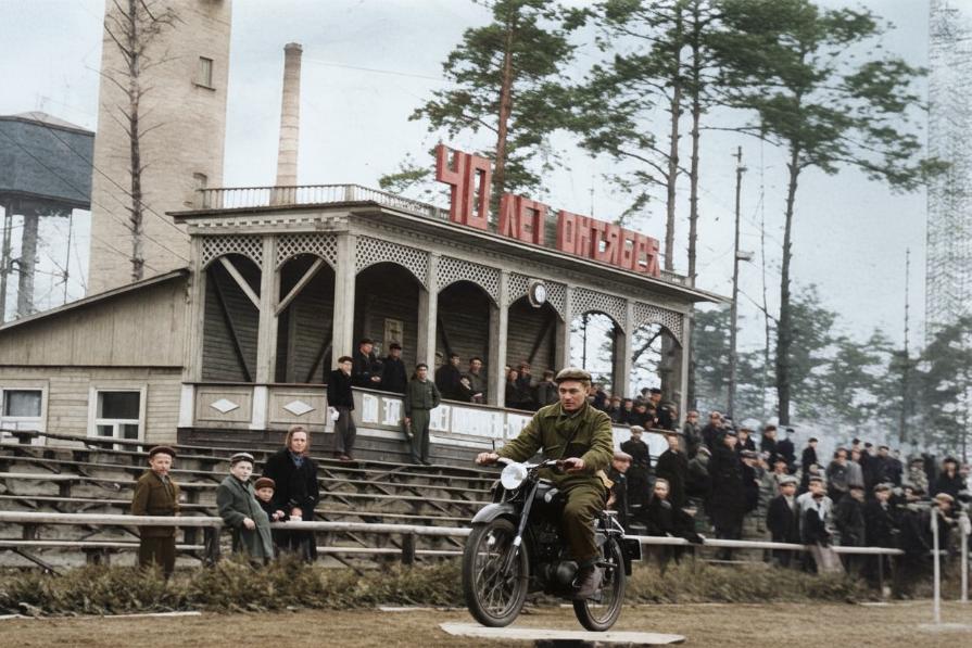 Дерев’яні споруди стадіонів, скромний одяг, написи на павільйоні та насичені кольори соснового лісу у фотоколоризації точно передають атмосферу тогочасного місця, яке стало символом спільності та щирих емоцій повоєнного Києва.