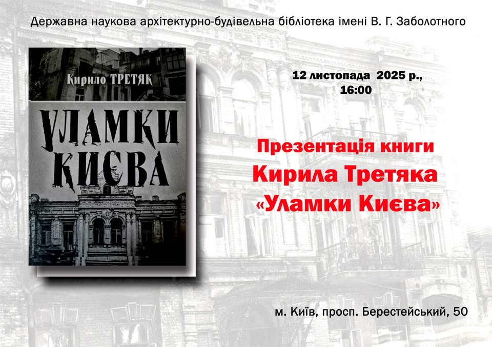 12 листопада 2025 року в 16:00 у Державній науковій архітектурно-будівельній бібліотеці імені В. Г. Заболотного відбудеться презентація книги Кирила Третяка "Уламки Києва".