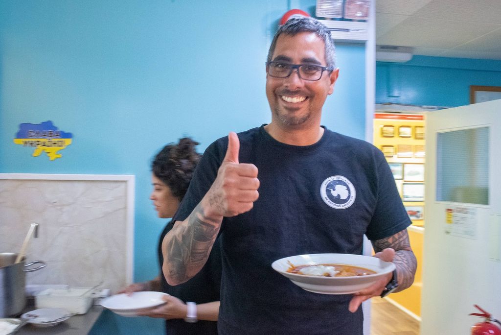 Якщо мексиканські вчені працюють на українській станції, значить, чим їх треба пригостити? Правильно — борщем! Що й зробили наші полярники на "Вернадському". Готував національну страву в неділю черговий на кухні геофізик Альберт Грабовецький, адже цього дня у кухарки експедиції єдиний вихідний. А допомагав науковцю учасник сезонної команди, інженер Олександр Лебідь.