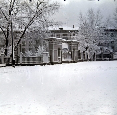 На наступній фотографії, зробленій взимку 1964-65 років, можна побачити краєчок тогочасного паркану школи. Як і паркан навколо стадіону ДВРЗ, шкільна огорожа була побудована з цегляного фундаменту і цегляних стовпчиків. Проміжки між стовпчиками перекривались дерев'яним штахетником з хвилястим верхом - як і в стадіонному паркані.
