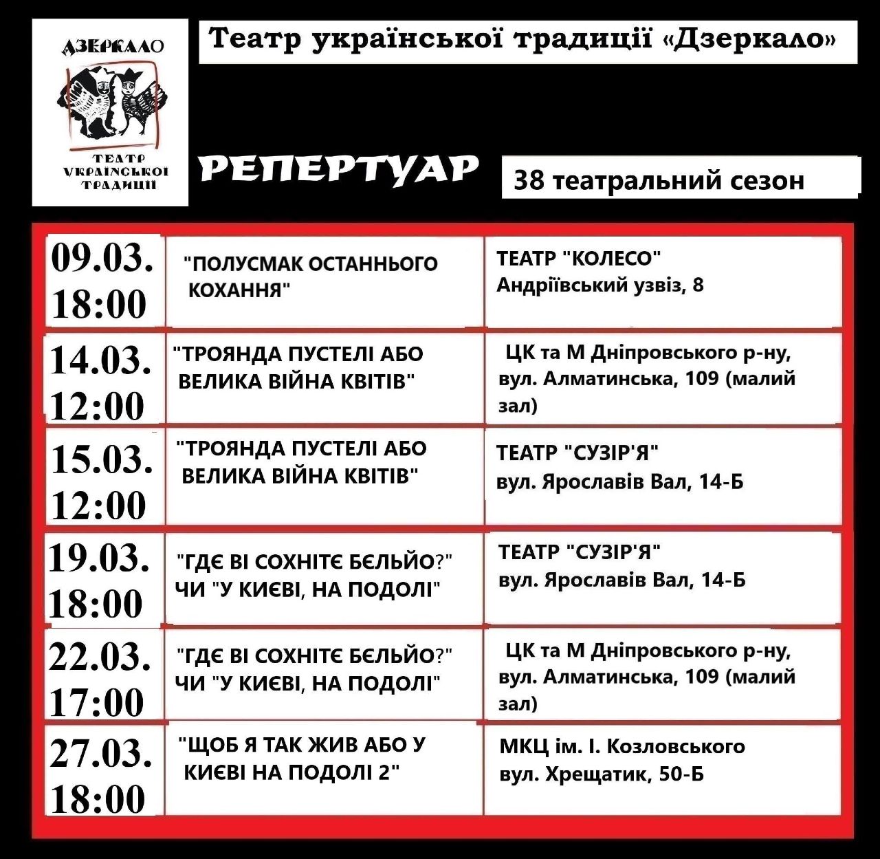 Театр української традиції "Дзеркало" протягом березня поставить у малому залі Центру культури та мистецтв на ДВРЗ дві вистави: 14 березня "Троянда пустелі або велика війна квітів" та 22 березня "Гдє ві сохнітє бєльйо? чи "У Києві, на Подолі ". Ще чотири березневі вистави цього театру відбудуться у приміщеннях інших культурних закладів - театрів "Колесо" та "Сузір'я", а також МКЦ імені І.Козловського.