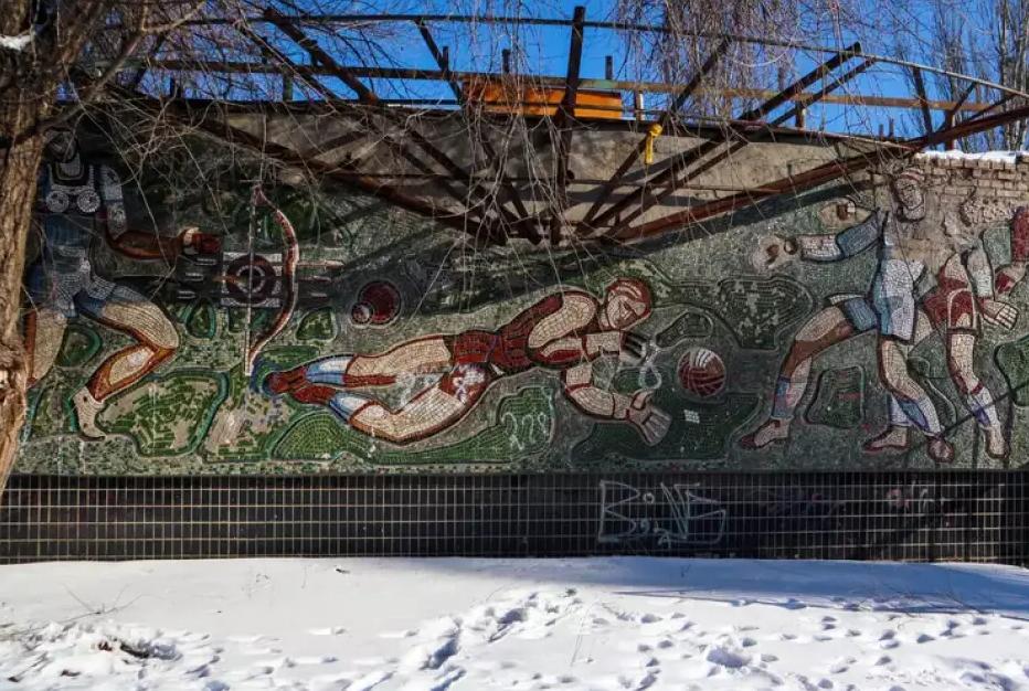 У Києві повільно руйнується унікальна мозаїка на вході до стадіону "Схід", розташованого за адресою: вулиця Привокзальна, 12/1. Про це повідомляє Музей окупації Києва. Точний рік створення панно та автор залишаються невідомими.