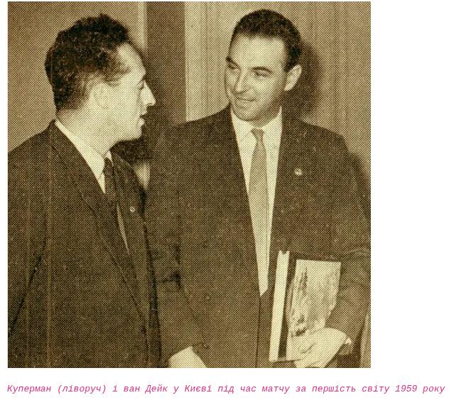 Тим часом стартував новий цикл боротьби за звання чемпіона світу. Право на матч із Куперманом отримав нідерландський гросмейстер Герт ван Дейк. 20 партій грали в листопаді-грудні 1959 року в п'яти совєцьких містах.