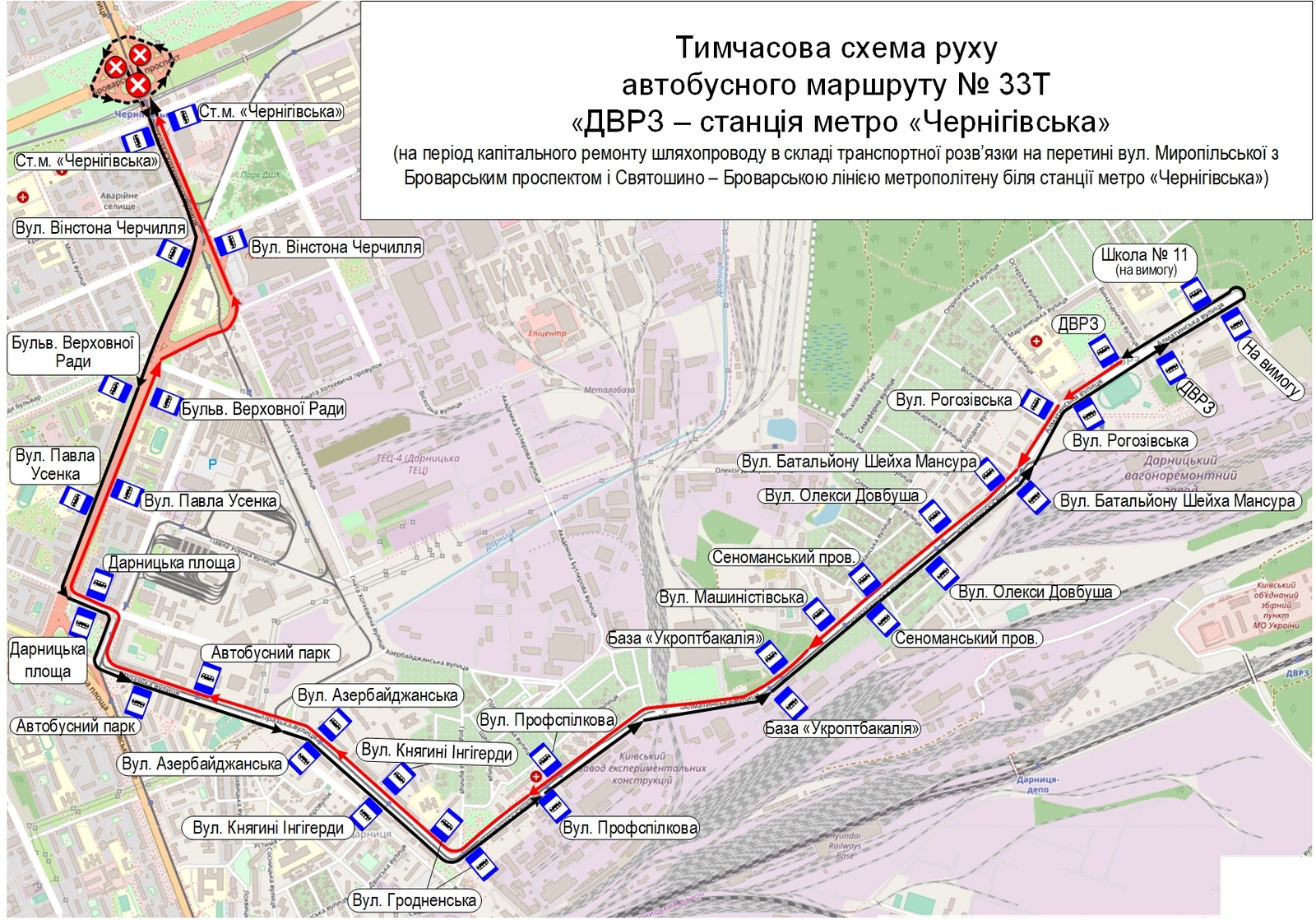 • автобусів № 33-Т – від Дарницького вагоноремонтного заводу до ст. м. "Чернігівська" за власним маршрутом, далі розворот на тимчасовій транспортній розв’язці, далі за власним маршрутом до Дарницького вагоноремонтного заводу;